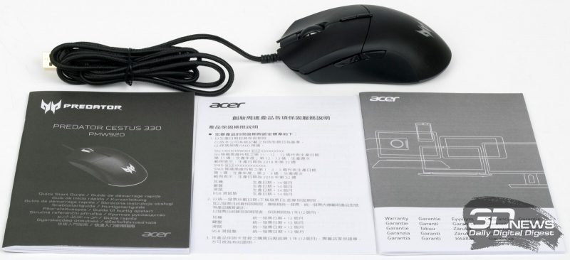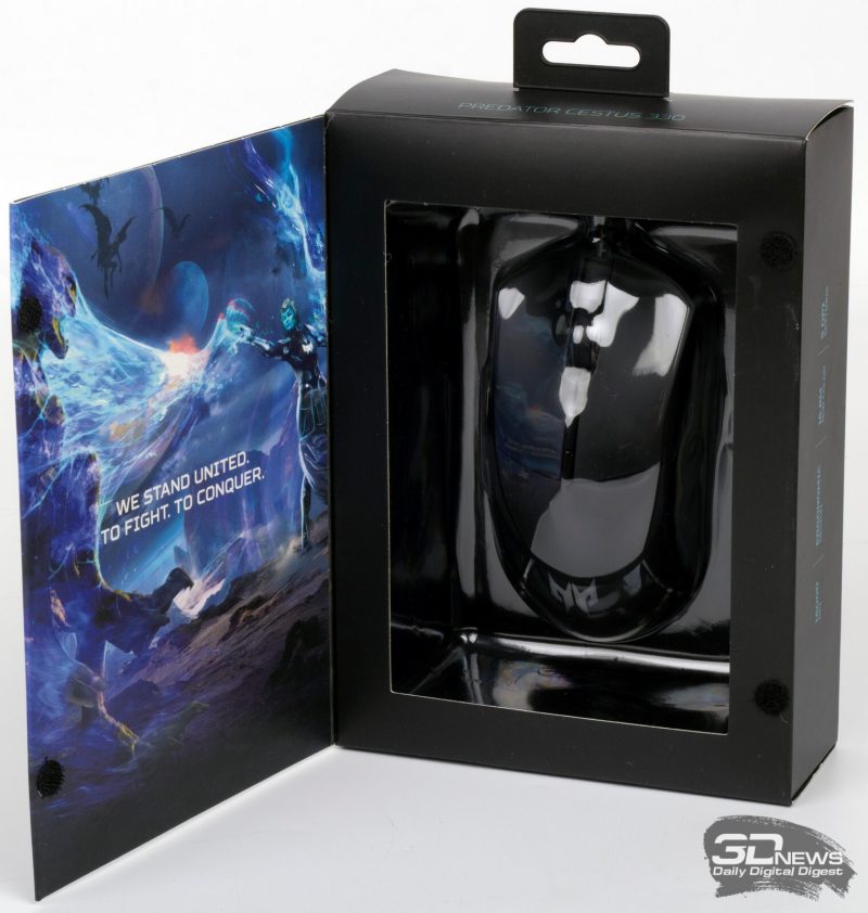 Juntamente com o monitor, o rato do Predator Cestus 330, compatível com esta tecnologia, veio a nós. Ao contrário do monitor, o custo do mouse não se transforma na emoção – o preço em 3.690 rublos por modelo com o maior sensor óptico Pixart 3335 e a iluminação RGB parece bastante humana.