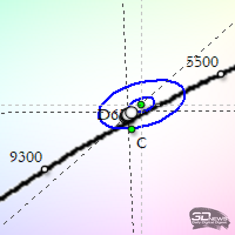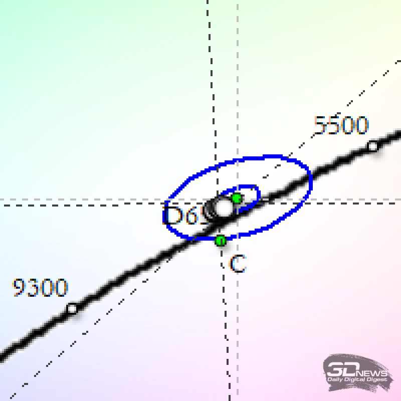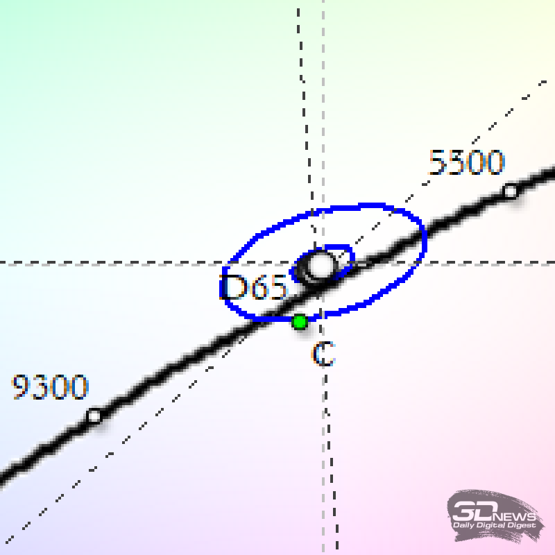 No entanto, é necessário levar em conta que a rejeição do ponto branco de apenas 0,43 unidades de Deltae refere-se a um nível automático definido de 6600 K, enquanto os valores de desvio já são 1.22 unidades a partir do alvo para o perfil SRGB. Isso também é suficiente para passar no teste, mas no nível de conformidade com os parâmetros padrão, e não recomendado.