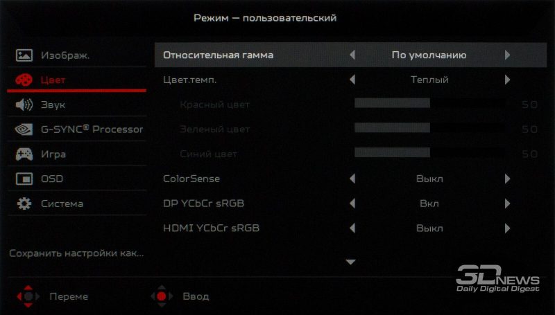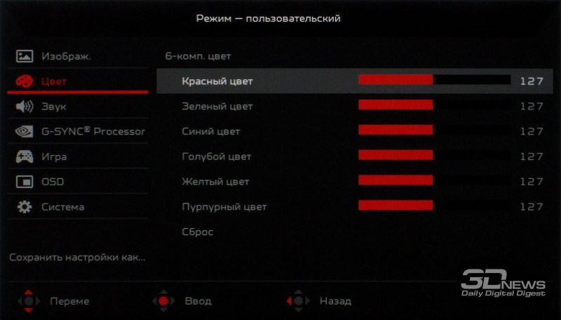 Na segunda página da seção, há a capacidade de definir a cor de seis componentes. Ao contrário dos conhecidos já dos monitores da Acer, a capacidade de selecionar o modo de emulação de vários espaços coloridos está ausente – a cobertura de cor da matriz é a mesma para quaisquer configurações.