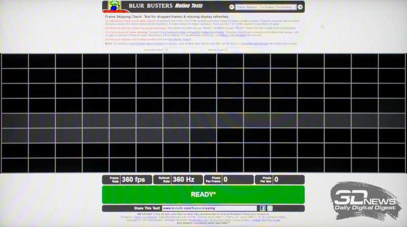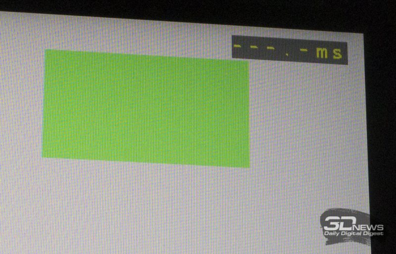 O modo NVIDIA ULMB com uma inserção de quadros pretas pode ser ativado quando a frequência de atualização é 144 ou 240 Hz quando o modo G-Sync estiver desativado nas configurações do driver. A luminosidade do campo branco é ajustada pelo ajuste da largura de pulso ULMB: a um valor de 0 é 23 CD / m2, e com um valor de 100 – 228,1 kD / m2 (alvo 100 CD / M2 foram alcançados a um valor de 44) . Contraste em comparação com o modo padrão levemente sobe e encontra-se dentro de 1160-1190: 1.