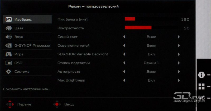 O menu inteiro inclui sete grandes partições, a primeira dedicada a configurar os principais elementos da imagem. Aqui você pode configurar o brilho, contraste, filtro azul, esclarecimento da sombra, variável de iluminação SDR / HDR e tempo de resposta, mudança automática de brilho e modo máximo de brilho (o padrão é desativado e o brilho nas configurações é limitado ao nível de 225 Nit, quando o brilho é ligado, o brilho máximo aumenta 450 nit).