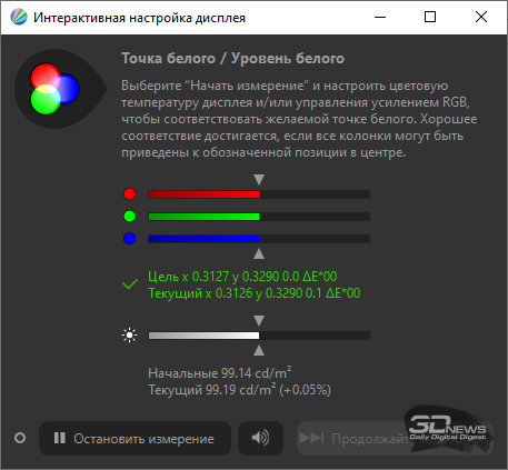 MANUAL RGB Melhorando e mudando o gamma permitido para resolver completamente e finalmente a questão com um ponto branco: o hit é quase perfeito. Desvios de patches de cores permaneceram a aproximadamente o mesmo nível, mas nas configurações padrão, não havia reclamações.