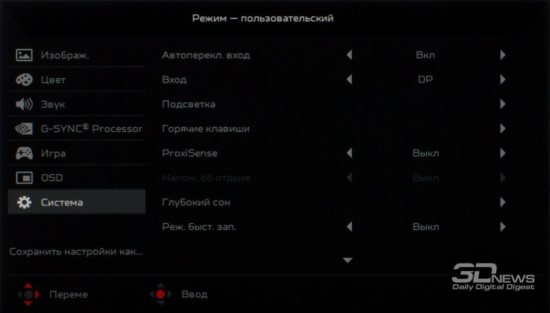 A última das principais seções de menu é responsável pelas configurações do sistema. Ele oferece uma seleção de entrada ativa, entrada automática, configurações de luz de fundo, reatribuir as funções dos botões, a função Proxisense (definição da presença do usuário na frente da tela com radiação IR) e quando está ativa – a capacidade de instalar um Lembrete de descanso, parâmetros de sono profundo (transição automática para o modo de suspensão na ausência de um sinal) e o início rápido do monitor (sem exibir o protetor de tela).