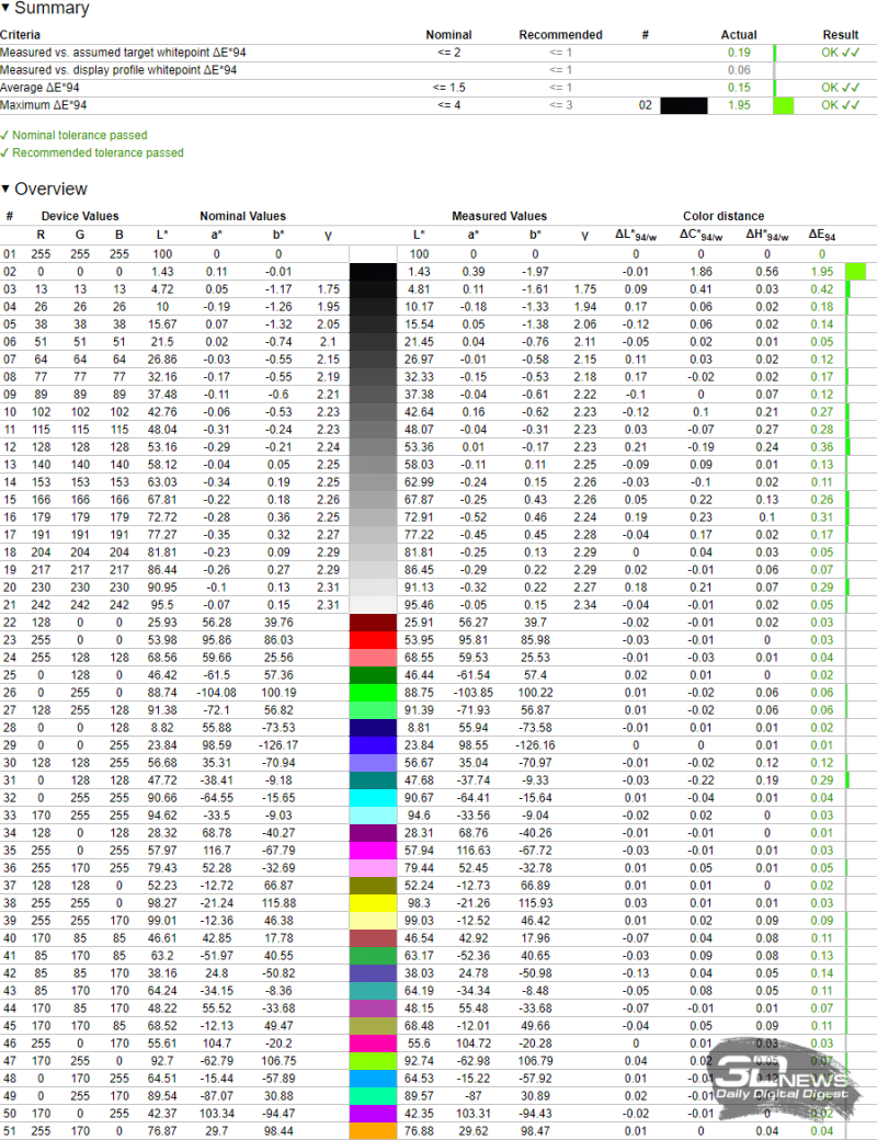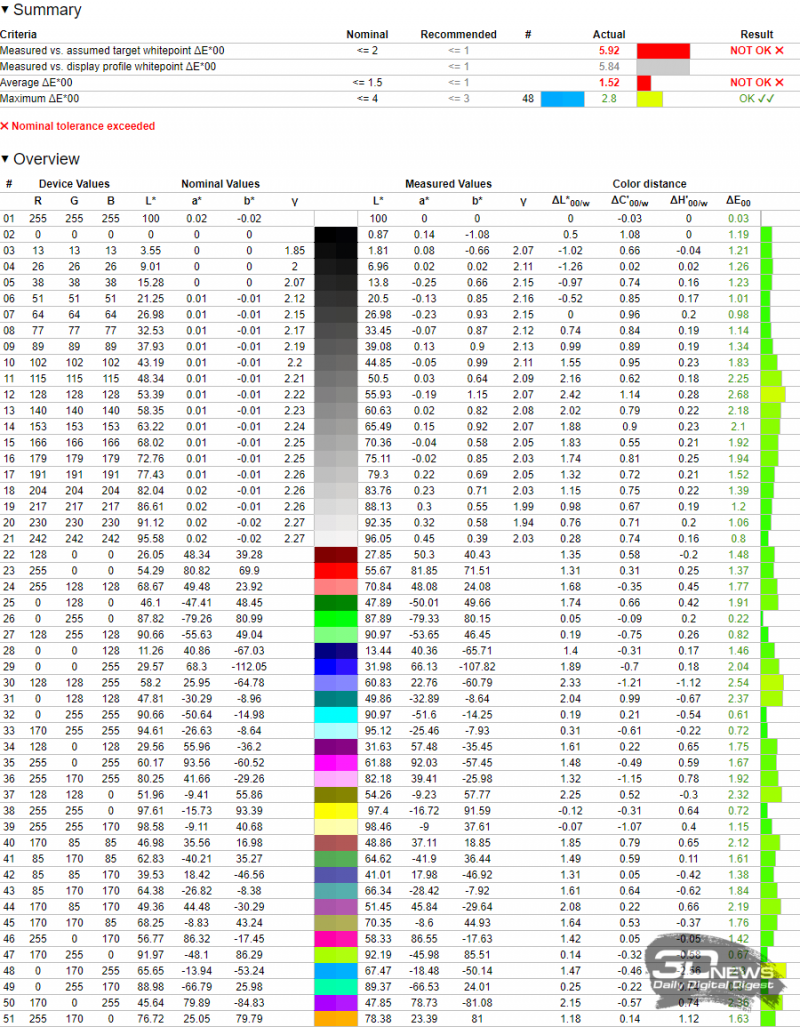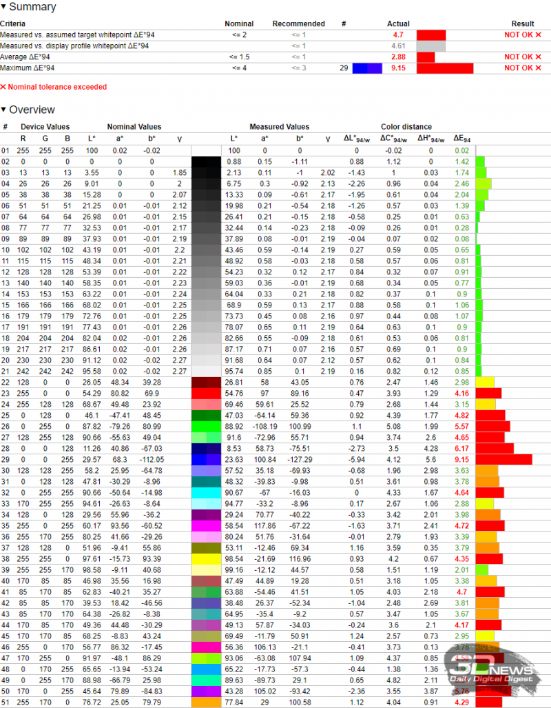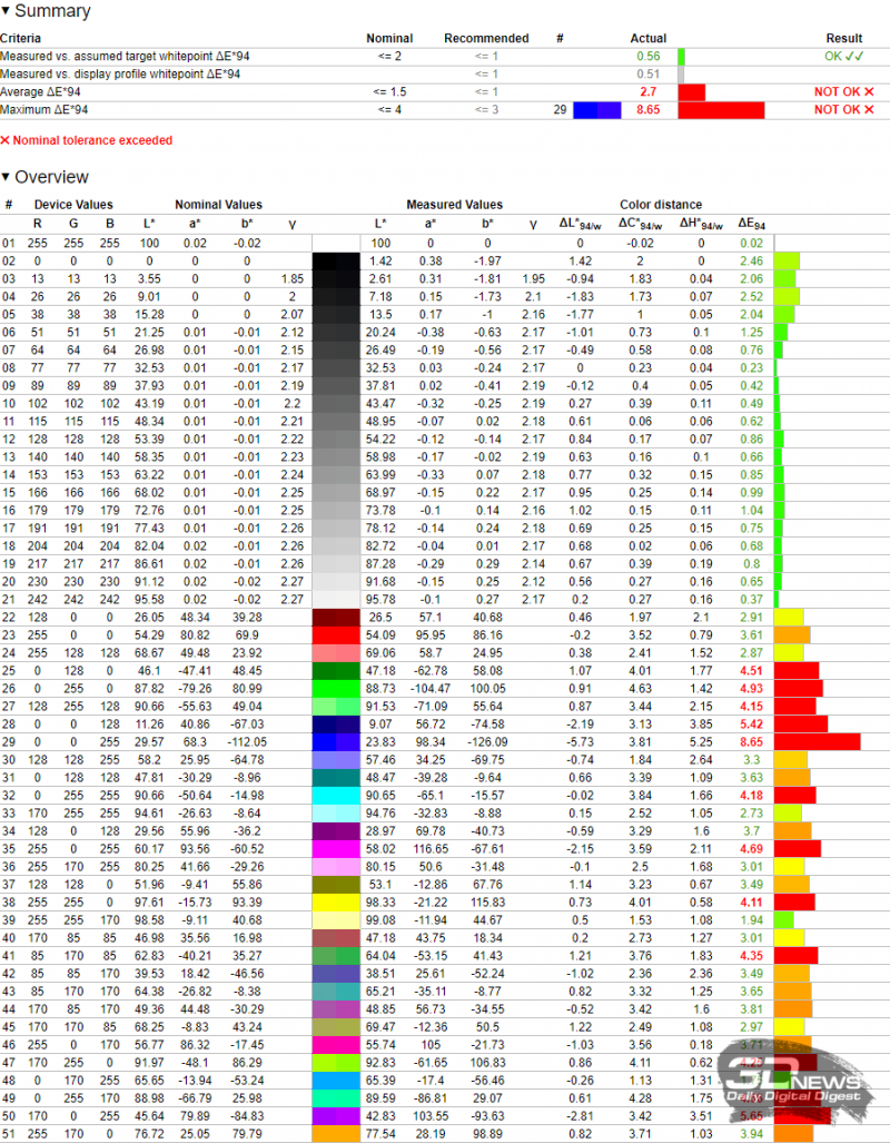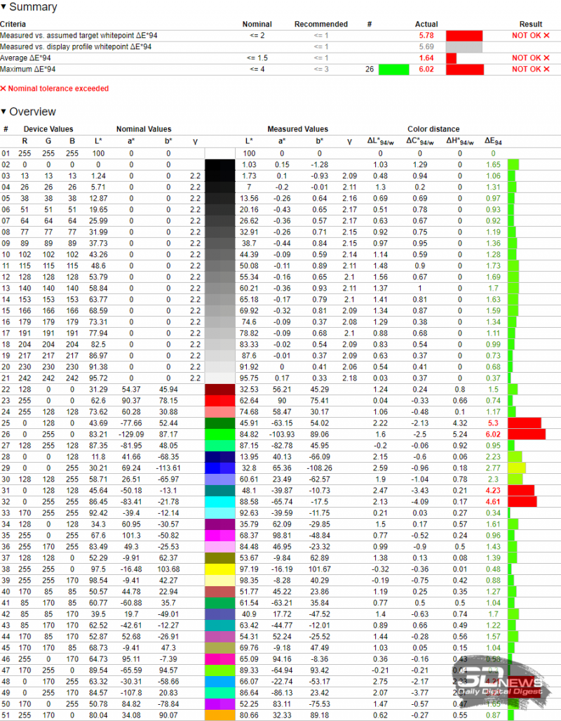 Como resultado, o teste Argyll acabou sendo aprovado apenas pelo nível máximo de desvios (com honras – pelo recomendado, e não apenas pelo nível permitido de desvios), mas o nível médio de desvios apenas excedeu o valor permitido por 0,02 unidades. Pode-se afirmar que as promessas do fabricante foram cumpridas: o nível médio de desvios DeltaE nas manchas de cores é inferior a 2 unidades.