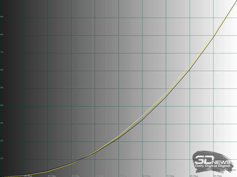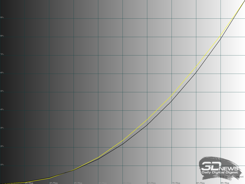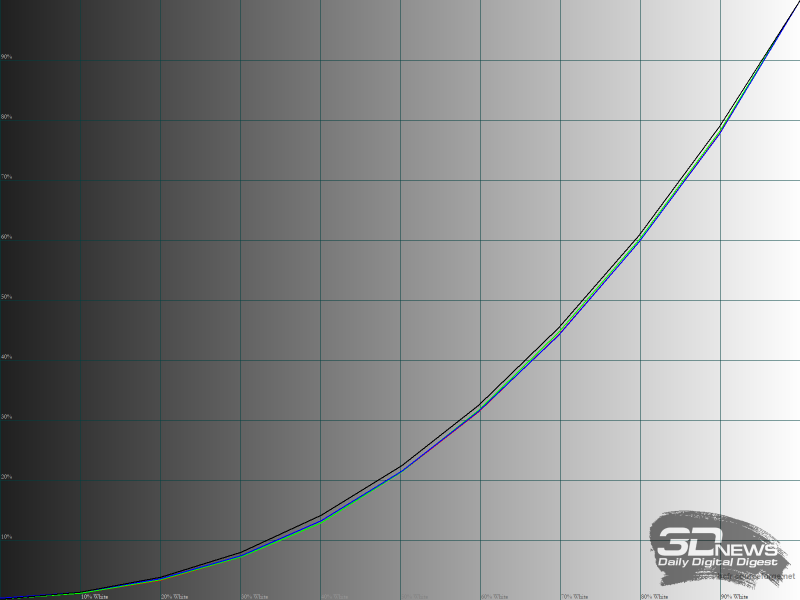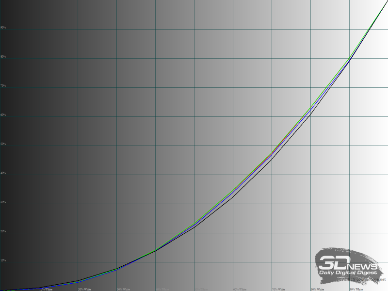 O nível médio de gama foi de 2,12 (menos que o modo padrão, mas maior que o modo sRGB), e a discrepância entre as curvas de cores individuais é quase a mesma do modo padrão e melhor do que no modo sRGB.