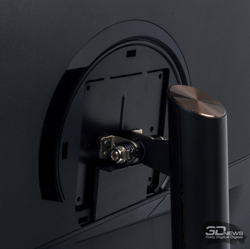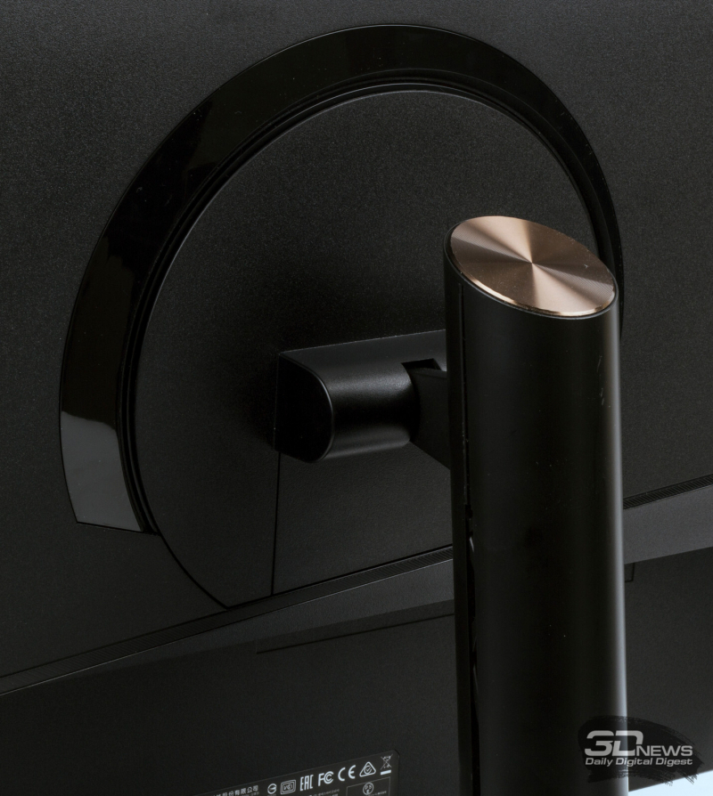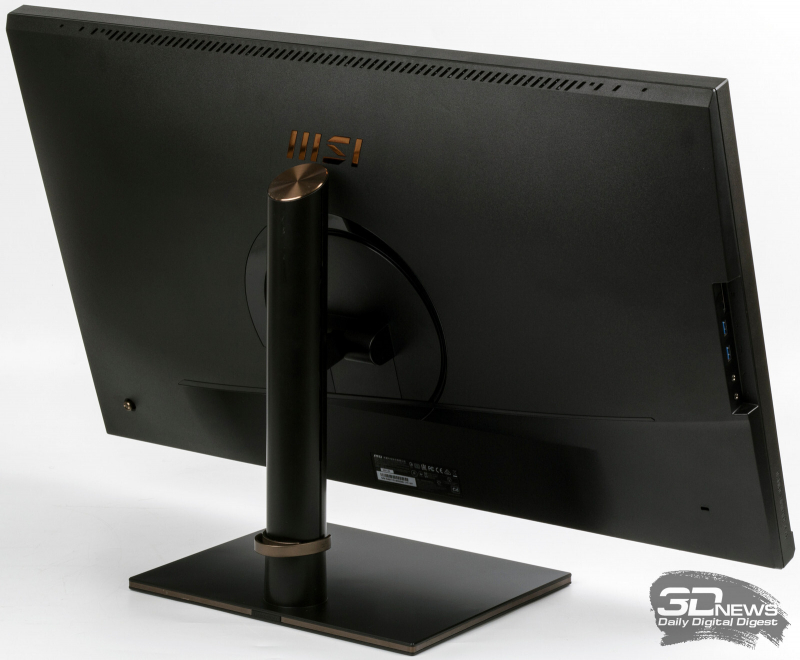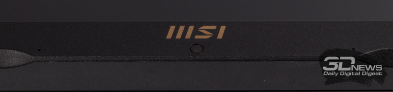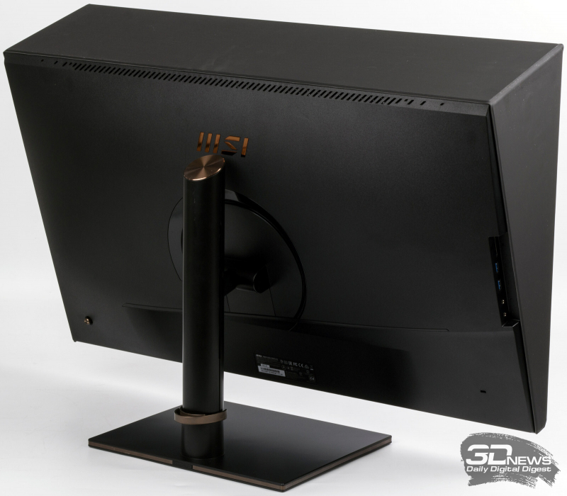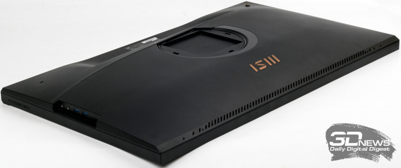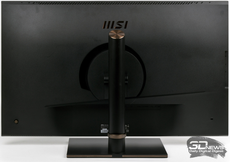 Ao longo da borda superior da parte traseira do monitor há uma série de saídas de ar e entre ela e a montagem da coluna central há um logotipo MSI estilizado em cor de cobre. Este tom unhackneyed complementa com bastante sucesso o plástico preto áspero prático da base do monitor, animando visivelmente a aparência do dispositivo: existem inserções metalizadas semelhantes na base do suporte e na coluna central.