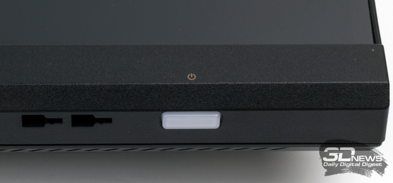 No centro do quadro inferior e mais largo da tela, há uma janela do sensor de luz ambiente. Nas laterais há orifícios visíveis embutidos no sistema de microfone do monitor com redução de ruído ativa.