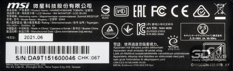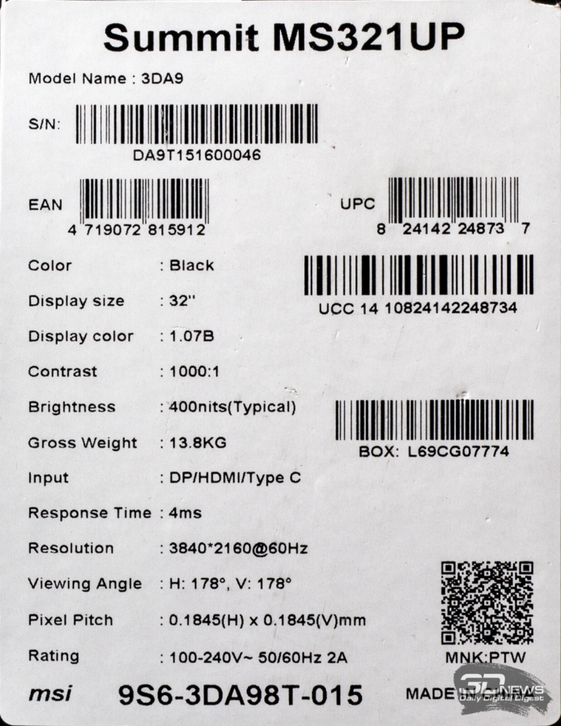 No adesivo na lateral da caixa, você pode descobrir várias características técnicas do modelo, número de série e país de fabricação (China).