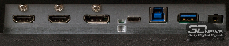 O painel de conectores do monitor inclui duas portas HDMI 2.0b e uma porta DisplayPort 1.2, um conector USB Tipo C (modo alt DP e PD 5V/3A), uma entrada USB Tipo B para comunicação com PC, um conector USB Tipo A, e entrada combinada de fone de ouvido e microfone de 3,5 mm.