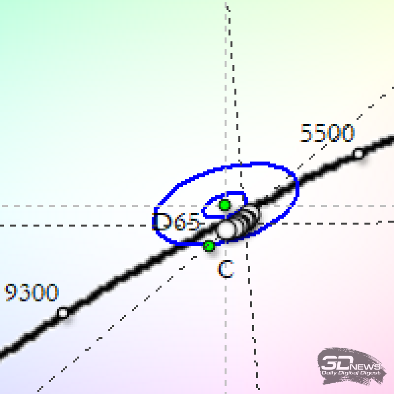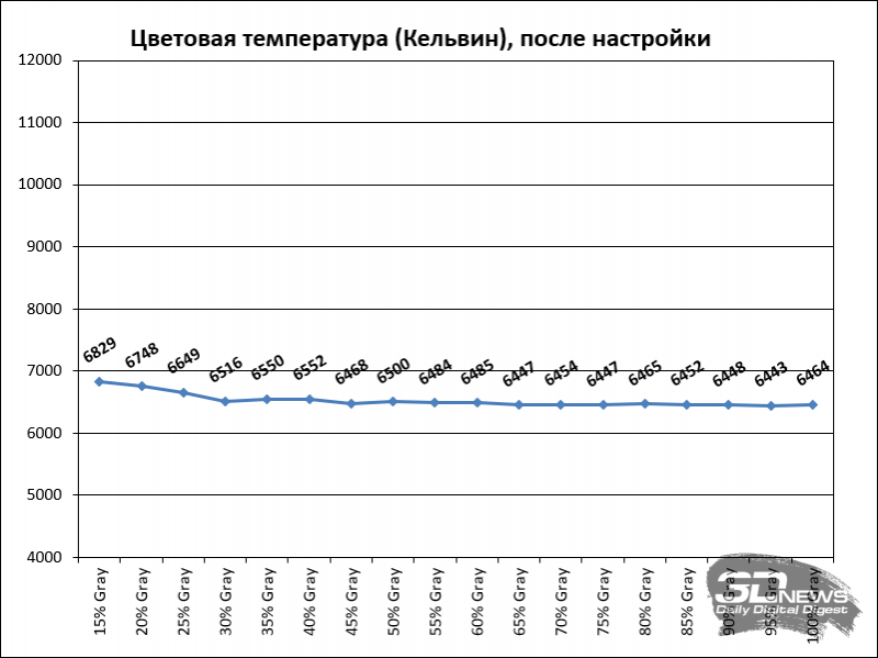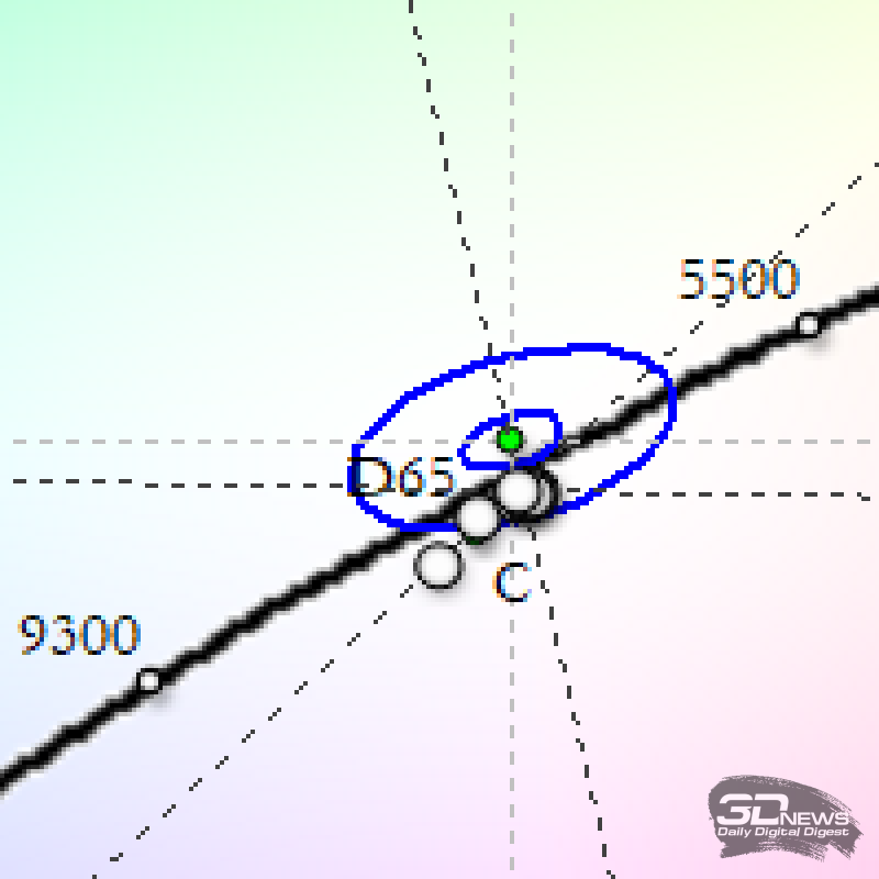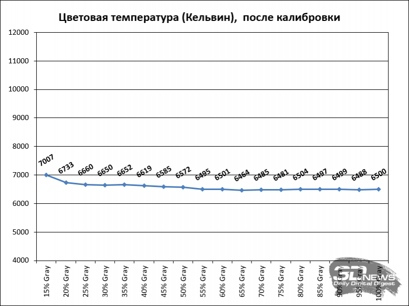 O desvio da temperatura de cor nas unidades DeltaE é de 3,7 em média e 6,75 é o máximo. Isso também não pode ser considerado um bom resultado, especialmente em termos do nível médio de desvios, mas o resultado ainda não é tão triste quanto o brilho irregular.