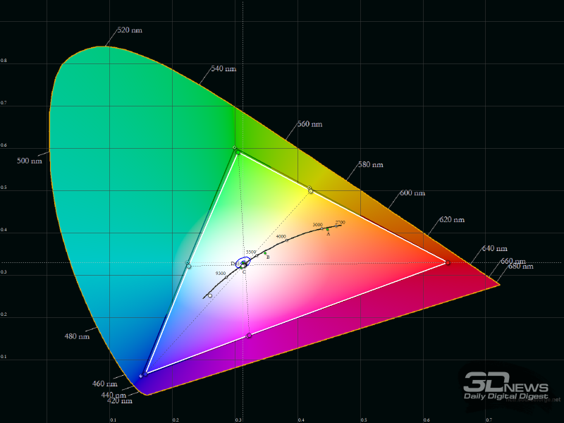 A gama de cores geral da matriz no modo sRGB era de 96,5% desse espaço de cores enquanto cobria 96,4% de sua área (apenas uma pequena área perto do topo vermelho do triângulo de cores foi além do sRGB). Pode ser chamado não ideal, mas um resultado bastante digno.