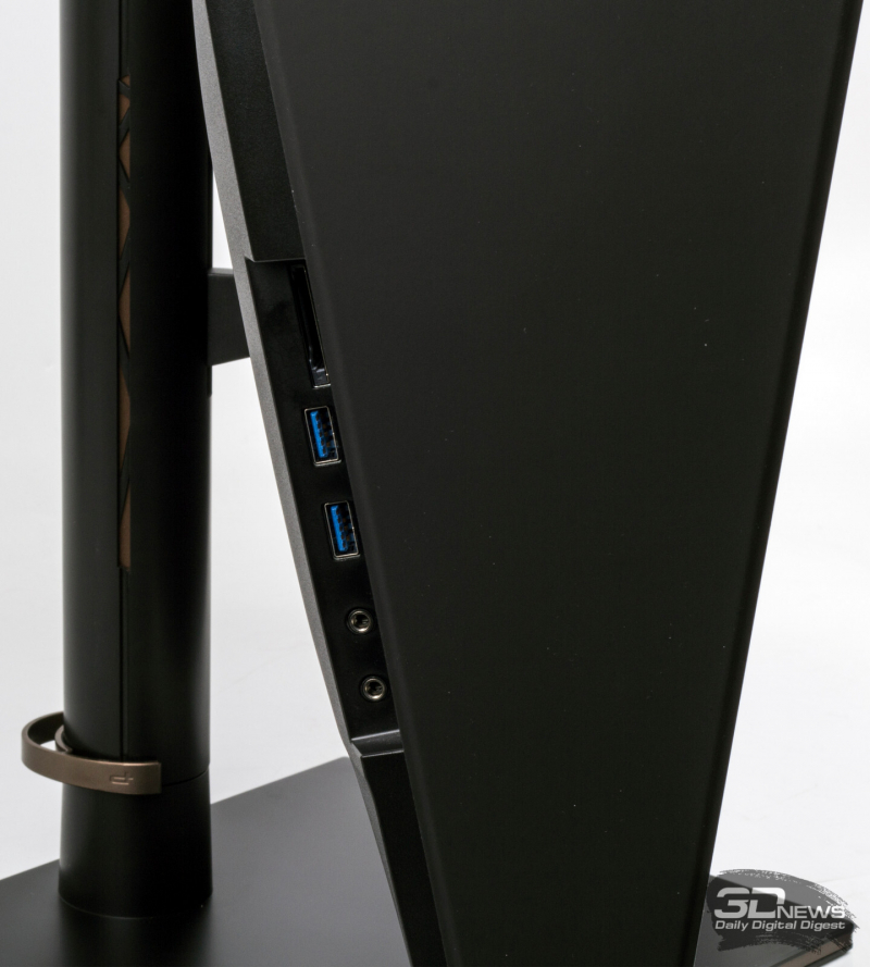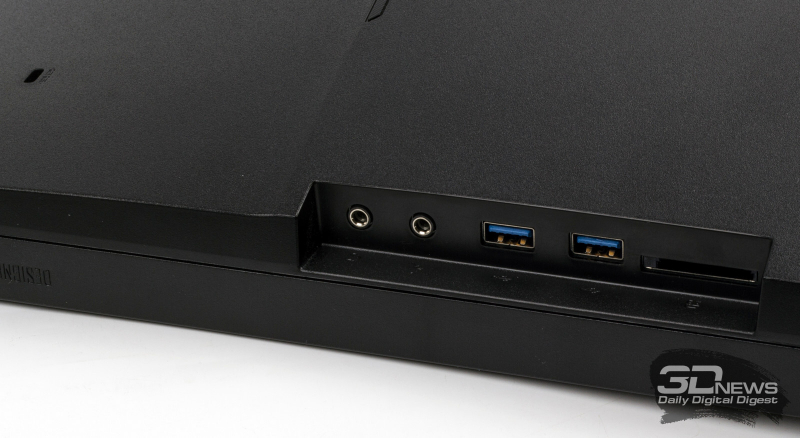 Conectores adicionais estão localizados no lado esquerdo do monitor: um slot para leitor de cartão de memória SD, duas portas USB Tipo A e dois conectores de 3,5 mm (entrada de microfone e saída de fone de ouvido). Como observamos anteriormente, o leitor de cartões funciona muito rápido.