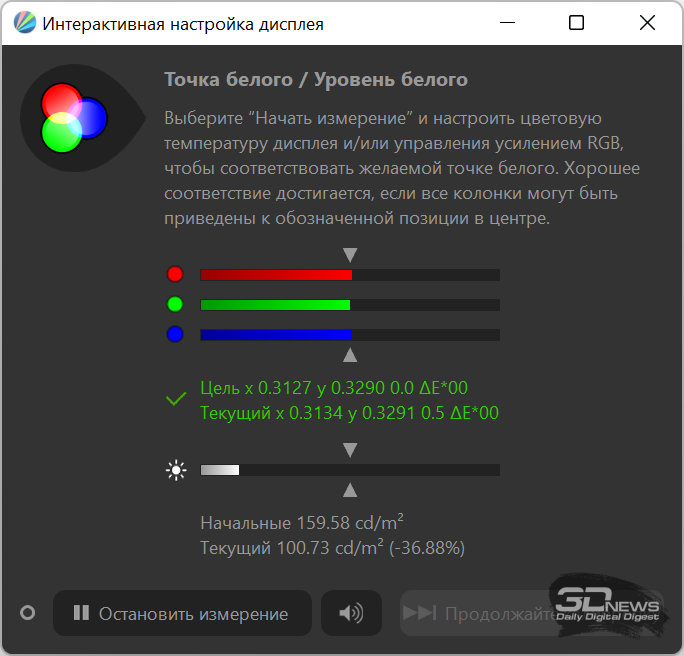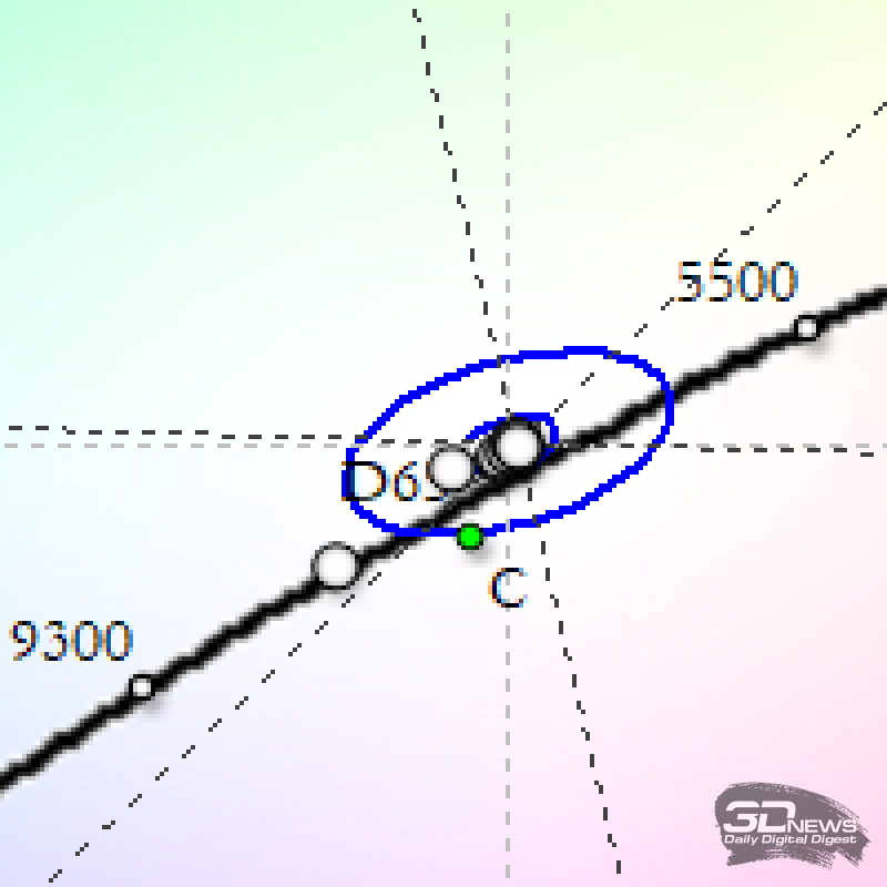 A posição do ponto branco quase coincidiu com o alvo, e os tons de cinza não perderam sua densidade – isso nos permite esperar uma redução significativa no nível de desvios de cores.