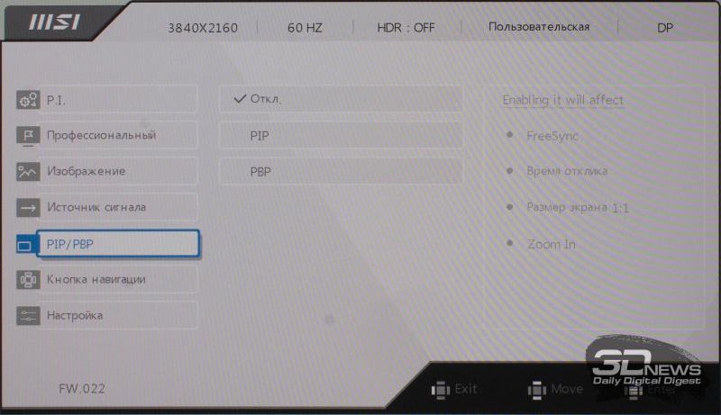 A próxima seção é dedicada às configurações da função PiP/PbP. Como em outras seções, há dicas aqui sobre quais recursos serão afetados quando essas configurações forem habilitadas.