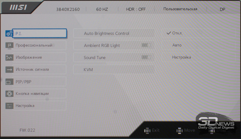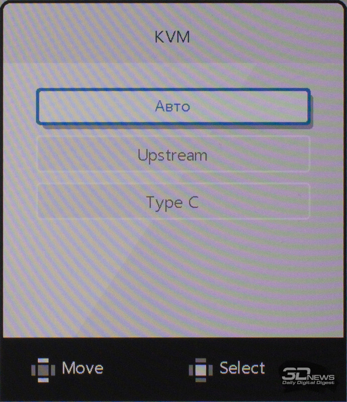 Na seção PI, você pode ativar o ajuste automático de brilho e temperatura de cor (o item “Ambient RGB Light” é responsável por este último, e não pela luz de fundo RGB externa ausente do modelo), ativar o ruído AI algoritmo de redução para o conjunto integrado de microfones e portas selecionadas (Upstream ou Type-C) para a função KVM.