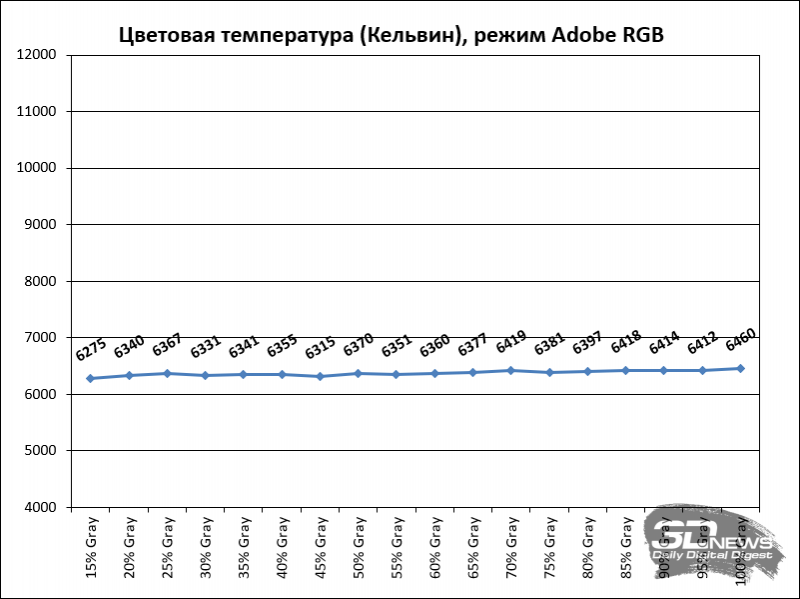 A configuração da temperatura de cor se assemelha à do modo sRGB com um aumento suave no gráfico junto com um aumento na luminosidade, mas difere em um tom um pouco mais quente – o valor máximo foi de 6460 K.