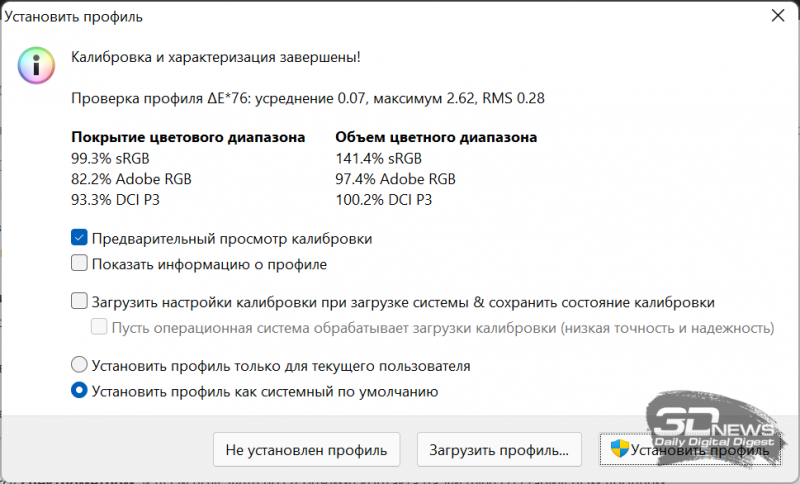 No servidor de arquivos 3DNews.ru, você pode baixar o perfil de cores para este monitor, que recebemos após a calibração no modo padrão com as configurações de imagem descritas acima.