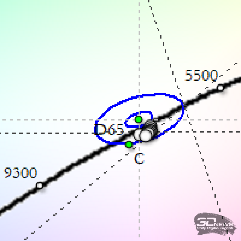 Ajustar manualmente o ganho RGB e alterar a gama nos permitiu definir corretamente o ponto branco, mas os desvios das manchas de cor diminuíram ligeiramente – o que, no entanto, não é surpreendente, dada a gama de cores expandida.