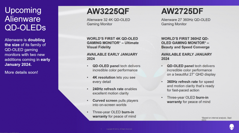 A Alienware anunciou os monitores de jogos AQ3225QF e AQ2725DF. Ambos os novos produtos foram mostrados no evento TwitchCon 2023. O fabricante chama o modelo AQ3225QF de o primeiro monitor de jogos 4K com tecnologia QD-OLED, e o modelo AQ2725DF de o primeiro monitor de jogos QD-OLED com taxa de atualização de 360 Hz.