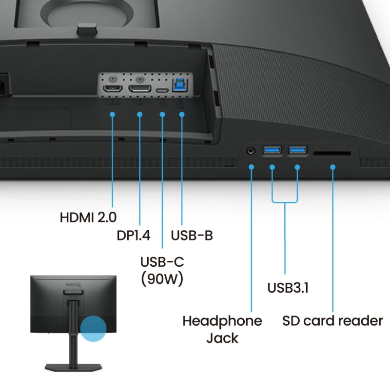 O BenQ SW242Q possui duas saídas de vídeo HDMI 2.0, uma DisplayPort 1.4 e um hub USB com dois USB 3.1 Tipo A downstream, um USB Tipo B upstream e um USB Tipo C com uma função DisplayPort alternativa e suporte de carregamento de 90W. Além disso, o novo produto recebeu leitor de cartões de memória SD, SDHC, SDXC e MMC, além de saída de áudio de 3,5 mm. O conjunto de entrega inclui um suporte ergonômico com capacidade de ajustar a altura da tela acima da mesa, bem como os ângulos de rotação e inclinação.