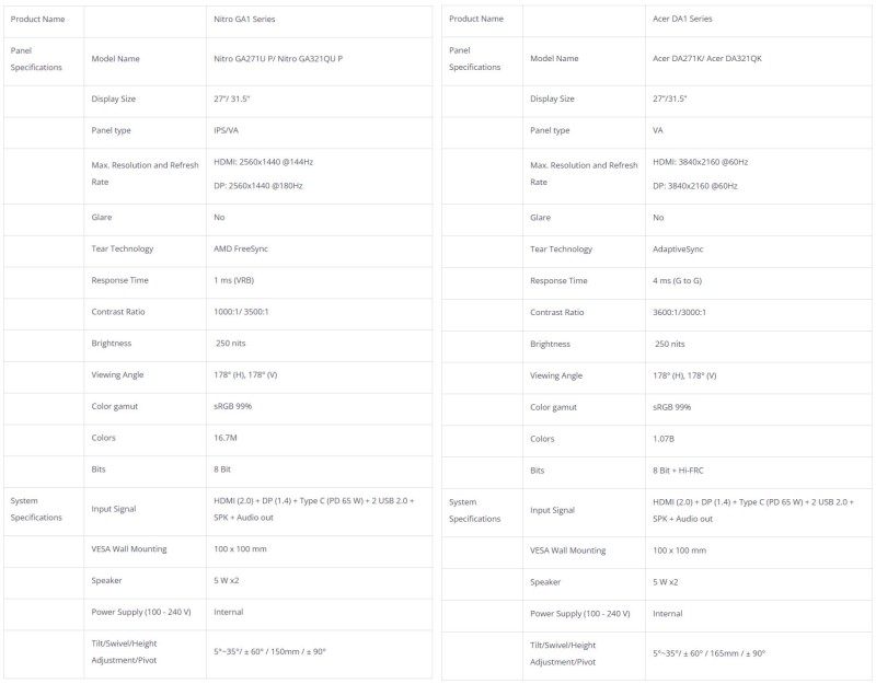 Por sua vez, o modelo Nitro GA271U P é baseado em uma matriz IPS de 8 bits com taxa de contraste de 1000:1. O monitor Nitro GA321QU P possui uma matriz VA de 8 bits com uma taxa de contraste de 3500:1. Ambos os monitores suportam a tecnologia de sincronização de imagem AMD FreeSync. Esses modelos também têm brilho máximo de 250 cd/m2 e cobertura de gama de cores sRGB de 99 por cento. O conjunto de portas externas é semelhante aos monitores da série DA1.