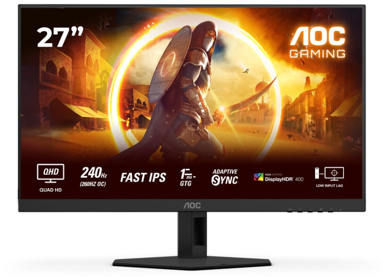 O AOC Gaming Q27G4ZR possui uma tela de 27 polegadas, suporta uma taxa de atualização de 240 Hz e overclock de até 260 Hz. Ele possui duas portas HDMI 2.0, uma DisplayPort 1.4, alto-falantes integrados de 2 W e um suporte totalmente ergonômico com as mesmas opções de personalização do seu irmão menor. O monitor também possui certificação DisplayHDR 400, suporta um brilho máximo de 400 cd/m², tem um tempo de resposta de 1 ms (GtG) e 0,3 ms (MPRT) e utiliza um painel Fast IPS com resolução QHD.