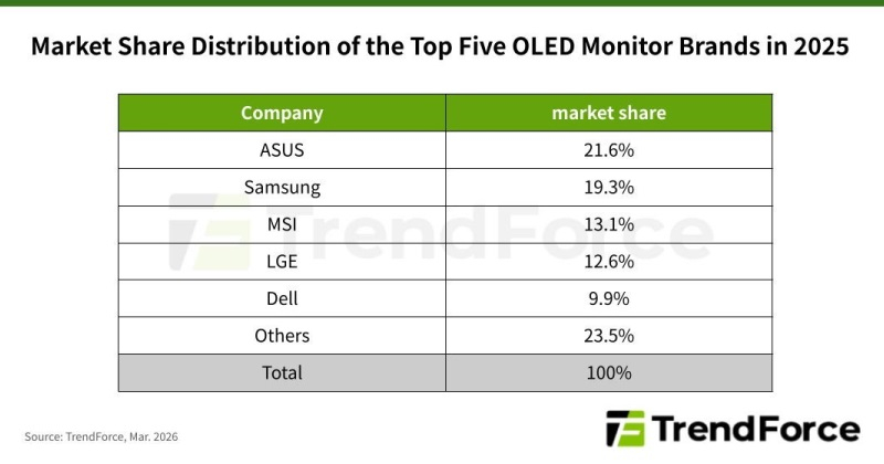 Completando o pódio está a MSI, que vem expandindo ativamente sua presença no mercado de monitores OLED para jogos nos últimos anos. No final de 2025, a empresa detinha 13,1% do mercado. Em meio à acirrada competição do setor, a MSI utilizou a rápida iteração de produtos e expandiu sua linha, que abrange diversas faixas de preço, para aumentar sua presença no segmento de jogos. A empresa se consolidou com sucesso como líder em tecnologia no segmento de monitores OLED de alta qualidade e fortaleceu sua posição como uma marca mainstream.