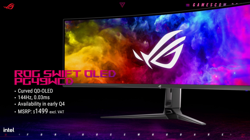 O fabricante também possui um novo modelo ultralargo de 49 polegadas do monitor ROG Swift OLED PG49WCD em uma matriz QD-OLED com resolução de 5120 × 1440 pixels, taxa de atualização de 144 Hz e resposta de 0,03 ms. A ASUS destaca que a novidade é equipada com conectores DisplayPort 1.4 e HDMI 2.1, além de USB Type-C com capacidade de transmitir até 90 watts de potência para um dispositivo externo conectado.