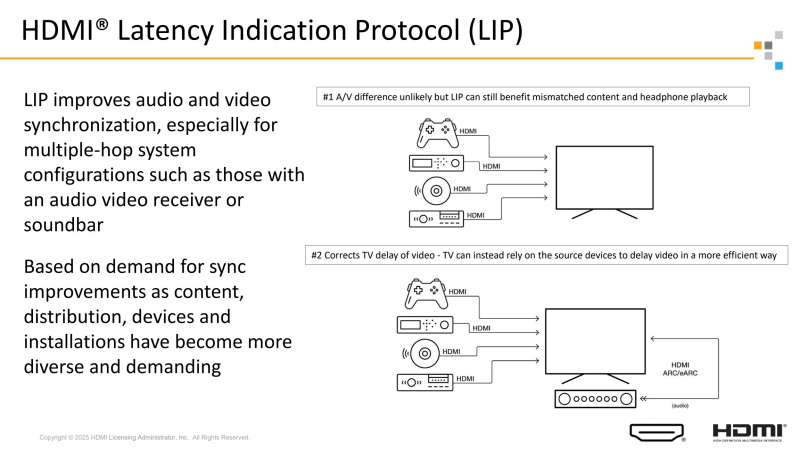 «A especificação também inclui o Protocolo de Indicação de Latência (LIP) para melhorar a sincronização de áudio e vídeo, especialmente em sistemas com múltiplos canais de comunicação, como um receptor AV ou barra de som. Além disso, a especificação inclui um novo cabo HDMI Ultra96 que suporta largura de banda de 96 Gbps e oferece recursos completos de HDMI 2.2. Isso faz parte do programa de certificação de cabos HDMI, que exige que cada modelo de cabo seja testado e certificado e possua uma etiqueta de certificação”, de acordo com o Fórum HDMI.