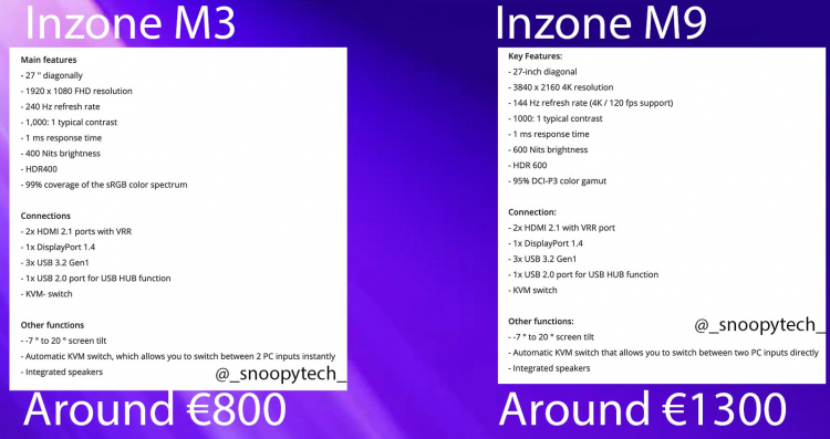 O modelo Inzone M3 tem resolução de 1920 × 1080 pixels (formato Full HD), taxa de atualização de 240 Hz e brilho de até 400 cd/m2. É alcançada uma cobertura de 99% do espaço de cores sRGB. A variante Inzone M9 está em conformidade com o padrão 4K – 3840 × 2160 pixels. Este painel tem uma taxa de atualização de 144Hz. O brilho é de até 600 cd/m2, e a cobertura do espaço de cor sRGB é de 95%.