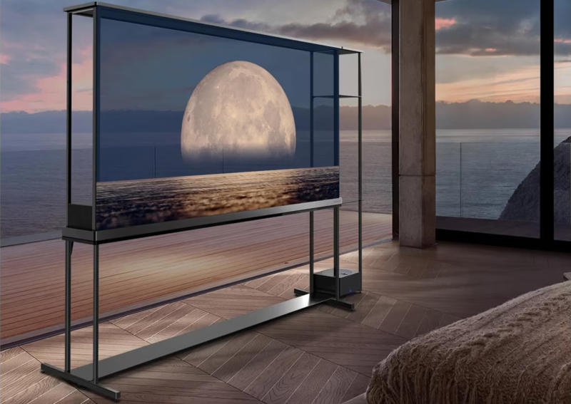O LG Signature OLED T permite alternar entre um modo transparente, no qual você pode ver tudo por trás do painel OLED, e um modo opaco, permitindo assistir programas com total conforto na tela de 77 polegadas. Para este último, atrás do painel Signature OLED T transparente em um tripé há uma cortina especial, que é levantada pressionando um botão no controle remoto.