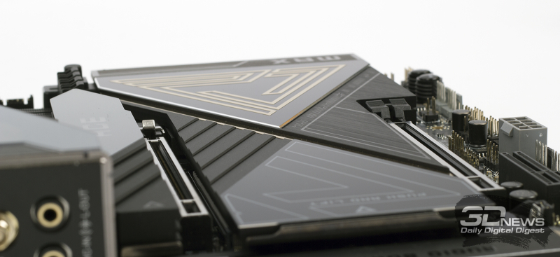 A placa-mãe tem uma aparência… brutal. Isso se deve em grande parte à sua impressionante “armadura”, composta por vários dissipadores de calor. Por se tratar de um dispositivo para jogos, ele evoca imediatamente associações com os lendários mercenários de Night City, repletos de implantes que beiram a psicose cibernética. O subsistema de energia do dispositivo é resfriado por dois dissipadores de calor conectados por um par de dissipadores de cobre.Tubos de calor; os locais de montagem do SSD ficam escondidos atrás de painéis M.2 Shield Frozr de alumínio de liberação rápida; os microchips do chipset são cobertos por uma placa de remoção de calor muito longa — e isso está longe de ser tudo.