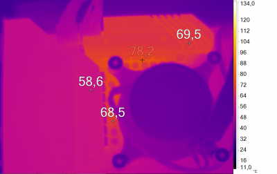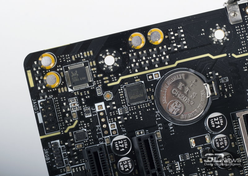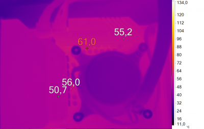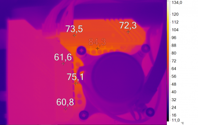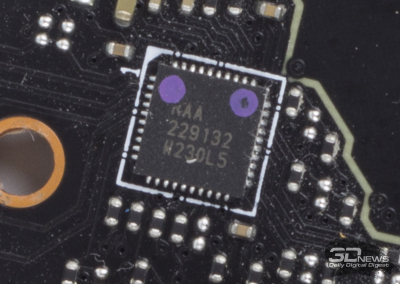 Digno de nota é o resfriamento da placa. Um dos radiadores revelou-se gigantesco – sua parte metálica também serve como invólucro decorativo que cobre os conectores do painel de E/S. A pressão dos radiadores sobre os transistores e bobinas é bastante forte, pois as barras metálicas são fixadas na placa de circuito impresso com parafusos. Entre os transistores e a sola de alumínio existem almofadas térmicas bastante grossas.