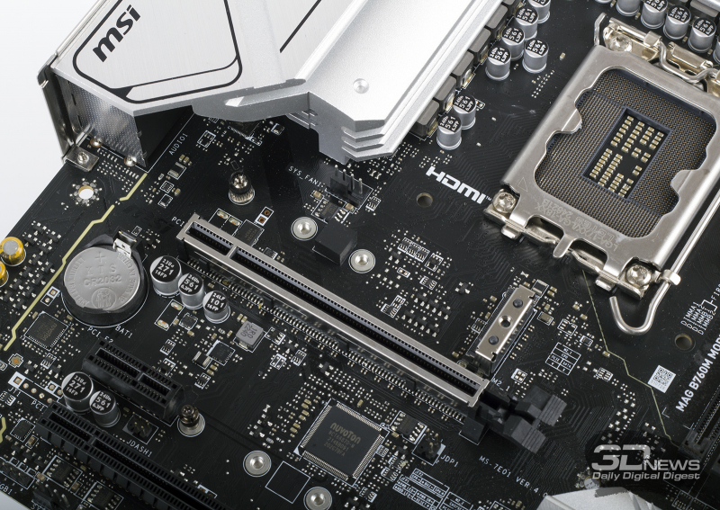 Mesmo no final de 2023, você pode encontrar o antecessor desta placa à venda – o modelo MAG B660M MORTAR WIFI. Essas placas são muito parecidas. No entanto, a modificação B760 suporta o padrão PCI Express 5.0 – a única porta PEG do dispositivo funciona neste modo. O conector da placa de vídeo também é reforçado com metal e todos os slots de expansão receberam mais pontos de solda. Ou seja, o MAG B760M MORTAR WIFI está pronto para abrigar até mesmo placas de vídeo de “categoria de peso” de ponta, cuja massa geralmente excede dois quilos. Os conectores PCI Express x4 e PCI Express x1 operam nos modos 4.0 e 3.0, respectivamente.