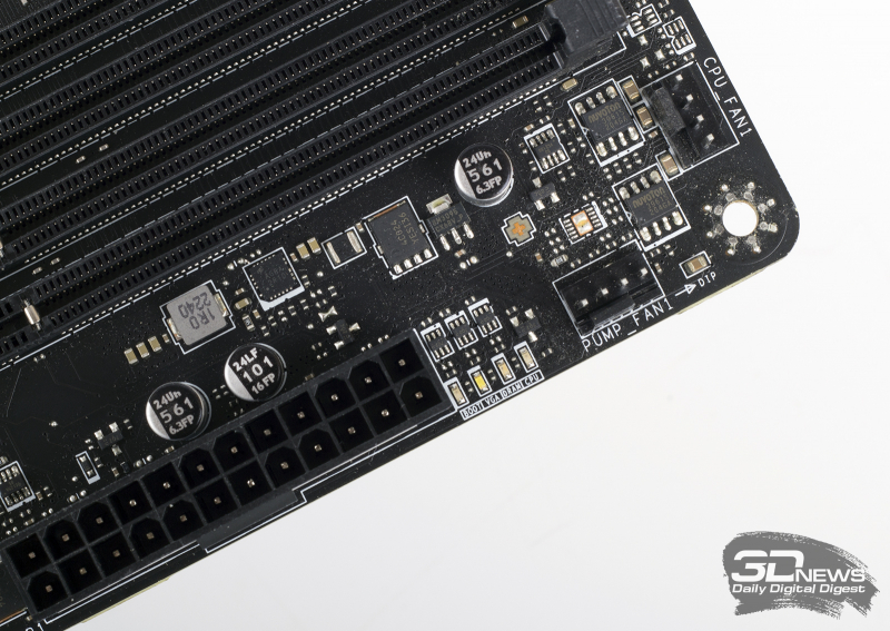 O herói da análise recebeu seis conectores para conectar ventiladores. Todos são de 4 pinos, mas as placas-mãe há muito tempo conseguem regular a velocidade do “Carlson” tanto com PWM quanto sem ele (com conectores de 3 pinos). O conector, preso entre o soquete do processador e o M.2 superior, não está muito bem localizado. Porém, seja melhor lá do que em algum lugar na “periferia” da placa de circuito impresso. Porque em uma montagem clássica com gabinete torre, em 99% dos casos, uma ventoinha montada na parede traseira será conectada a ele. A localização dos conectores de 4 pinos restantes me convém perfeitamente.