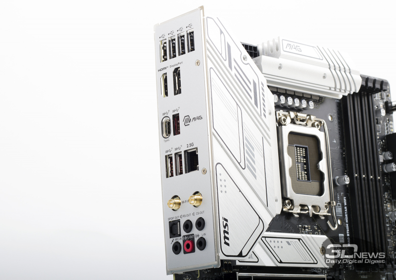 A funcionalidade do MAG B760M MORTAR WIFI não mudou em comparação com a versão B660. O conjunto de portas e módulos é suficiente e moderno, o que é importante dada a potencial sobreposição de todos os slots de expansão. Assim, no painel de E/S, que não necessita de plugue removível, existem portas USB com largura de banda de 10 e 20 Gb/s, tipos A e C. Tanto HDMI quanto DisplayPort estão presentes entre as saídas de vídeo, e USB 3.2 Gen1 tipo C (10 Gb/s) está entre os conectores internos.