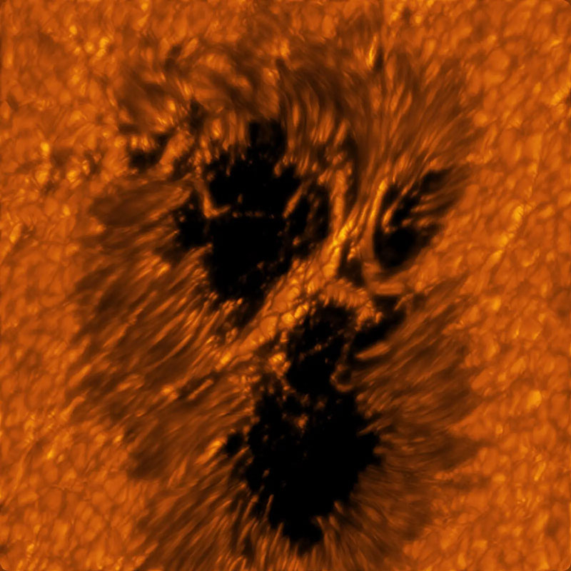 O centro da mancha no Sol (umbra) e a penumbra circundante (penumbra)