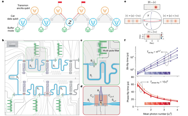 No diagrama esquemático acima, cada qubit cat está conectado ao seu transmon vizinho. Isso permite que os transmons rastreiem o que está acontecendo nos qubits do gato usando as chamadas medições fracas. Essas medições não destroem o estado quântico como em uma medição completa, mas permitem que mudanças em qubits de cat vizinhos sejam detectadas e as informações necessárias para corrigir erros, caso ocorram, possam ser extraídas.