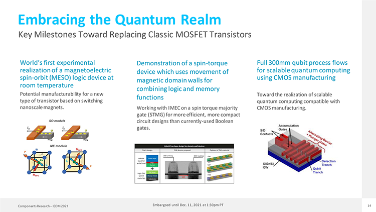 A empresa demonstrou a primeira implementação experimental do mundo de um dispositivo magnetoelétrico spin-orbit lógico em temperatura ambiente, demonstrando o potencial para um novo tipo de transistor baseado em comutação de ímãs em nanoescala. A Intel também falou sobre a possibilidade de produzir a produção de qubits em wafers de 300 mm usando uma tecnologia de processo semelhante ao silício convencional.