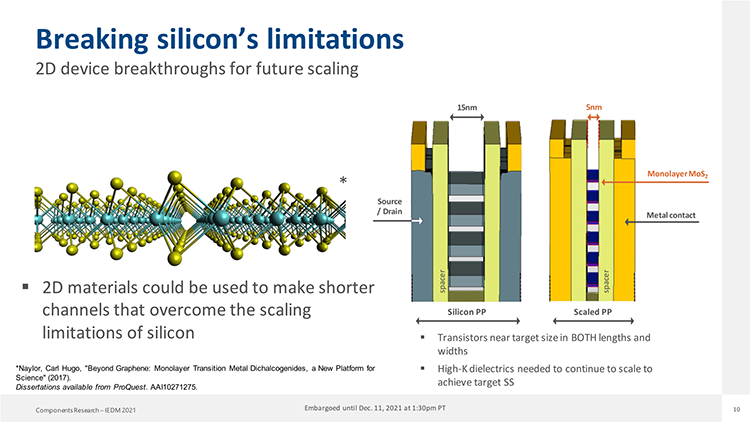Além disso, a Intel disse que para dar continuidade à Lei de Moore na era dos processos tecnológicos com uma resolução dos angstroms, novos materiais podem ser usados que permitem criar transistores com um canal de vários átomos de espessura – muito menor do que as portas lógicas de silício usuais.