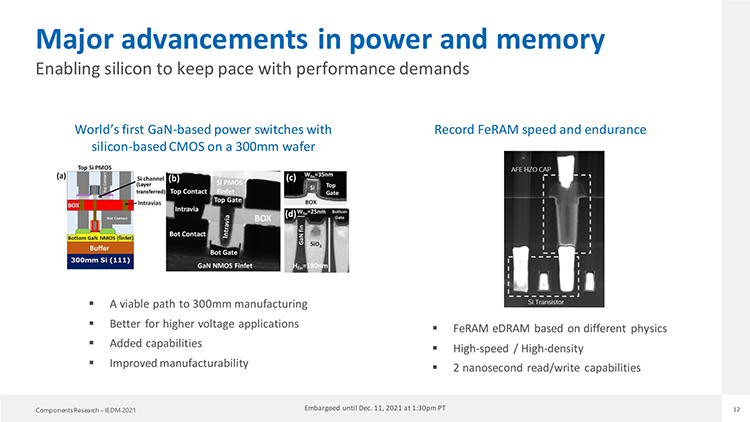 Ao mesmo tempo, a empresa falou sobre sua capacidade de criar memória embarcada (eDRAM) com latência de 2 ns baseada em novos materiais ferroelétricos. Essa memória FeRAM pode ser usada em processadores de consumidor e aceleradores computacionais como memória cache de baixo nível.