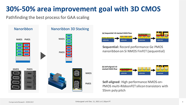 O segundo tópico do relatório foi a tecnologia de empilhamento vertical de vários transistores GAA, o que aumentará a complexidade dos cristais semicondutores em 30-50%, colocando mais elementos lógicos por unidade de área. No primeiro estágio, uma variante de uma pilha de dois transistores MOS com canais do tipo n e p e diferentes variantes de sua produção são investigadas.