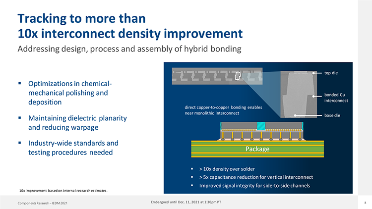 Uma das áreas de trabalho dos pesquisadores da Intel passou a ser o aprimoramento das conexões de chips para seu layout 3D em soluções híbridas unificadas (multichiplet). Os métodos propostos pelos engenheiros permitirão aumentar em dez vezes a densidade dos contatos nas interconexões. Anteriormente, a Intel anunciou a tecnologia Foveros Direct, dentro da qual a distância entre os contatos de cobre durante a montagem 3D pode ser reduzida para menos de 10 mícrons. Isso possibilitará a composição de soluções a partir de um maior número de cristais produzidos por processos técnicos mais avançados.