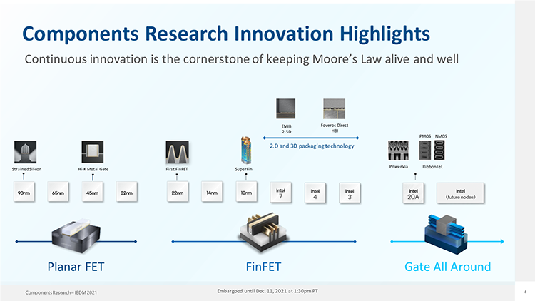 A equipe de P&D da Intel revelou neste fim de semana avanços fundamentais no empacotamento de chips, transistores e física quântica que serão lançados nos próximos dez anos para ajudar a empresa a continuar avançando em linha com a Lei de Moore. O relatório foi feito no 67º IEEE International Electron Devices Meeting (IEDM) 2021, realizado em San Francisco.