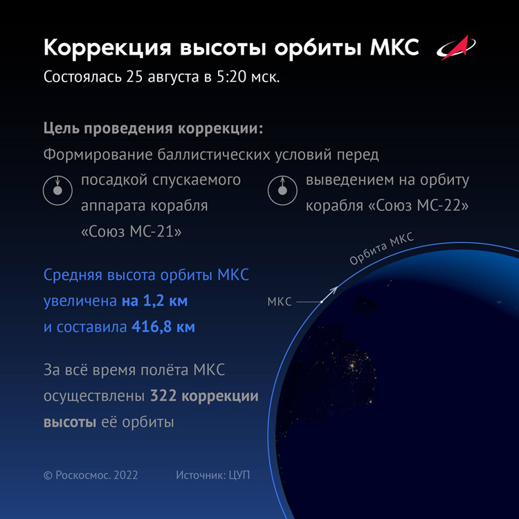A Corporação Estatal Roscosmos anuncia que esta manhã, 25 de agosto de 2022, foi realizada uma correção planejada da altura orbital da Estação Espacial Internacional (ISS).