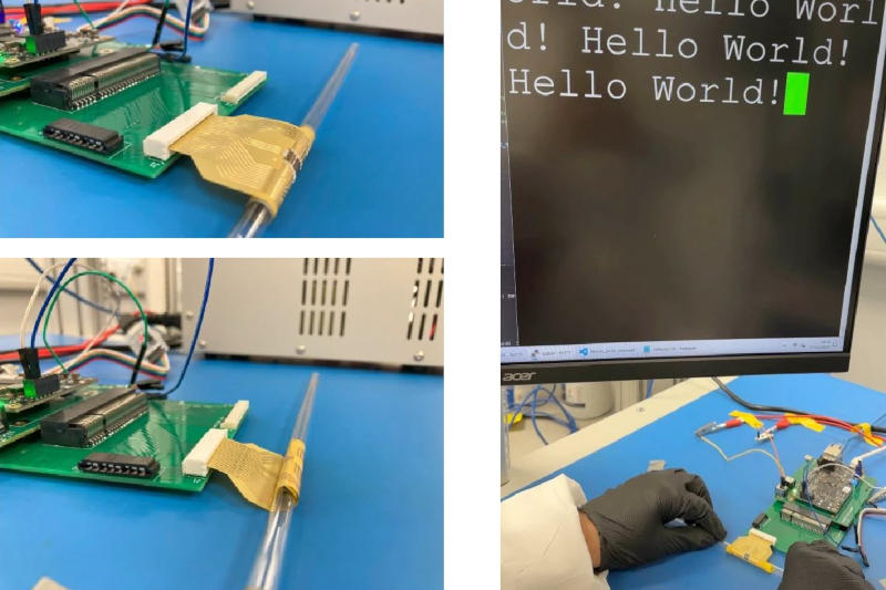Durante o teste, o microcontrolador continuou a operar quando dobrado até um raio de 5 mm. O rendimento variou em alguns pontos percentuais, mas no geral o Flex-RV lidou muito bem com a flexão. Sua diferença em relação a muitos projetos semelhantes é que ele usa componentes não rígidos em uma placa de circuito impresso flexível – o circuito integrado do microcontrolador também pode torcer e deformar.
