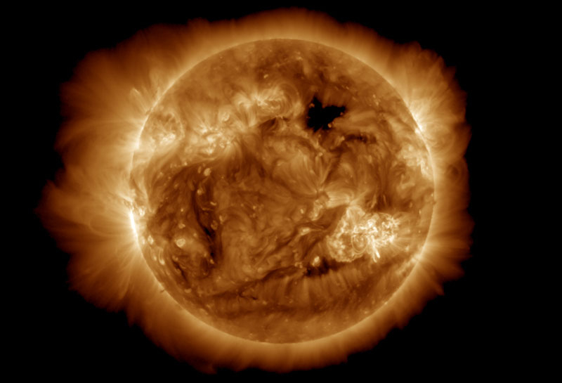 O sol em 10 de maio de 2024 através de filtros ultravioleta. Fonte da imagem: NOAA