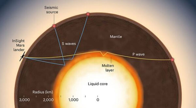 Agora, cientistas de França e da Suíça estudaram os dados do InSight com mais detalhe e com maior cobertura, e ambos os grupos concluíram de forma independente que um oceano de 150 quilómetros de silicatos derretidos se espalha em torno do núcleo de Marte. Se a interpretação dos dados estiver correta, e muitos fatores indicarem isso, então o raio do núcleo marciano é um pouco menor, ou seja, 1650-1675 km.