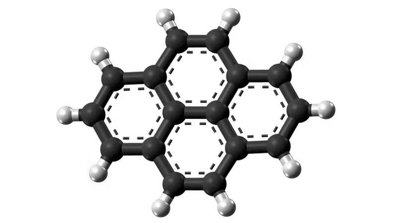 Molécula de pireno (até os átomos são carbono, os átomos brancos são hidrogênio). Fonte da imagem: Wikimedia