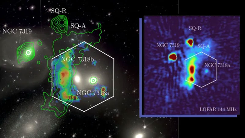 No novo trabalho, os cientistas combinaram dados do Low Frequency Array (LOFAR), dos radiotelescópios Very Large Array e do espectrômetro William Herschel Telescope Enhanced Area Velocity Explorer (WEAVE) no telescópio. William Herschel em La Palma (Espanha) com imagens de “James Webb”. Os dados globais ajudaram a reproduzir em detalhe o local do “acidente”, durante o qual a galáxia NGC 7318b colidiu com os restos de colisões anteriores a uma velocidade de 3,2 milhões de km/h. A velocidade da frente da onda de choque revelou-se tão alta que foi capaz de arrancar elétrons das órbitas dos átomos de gás e poeira interestelar. Surgiram regiões de plasma que são claramente visíveis nos dados do radiotelescópio e no espectrômetro.